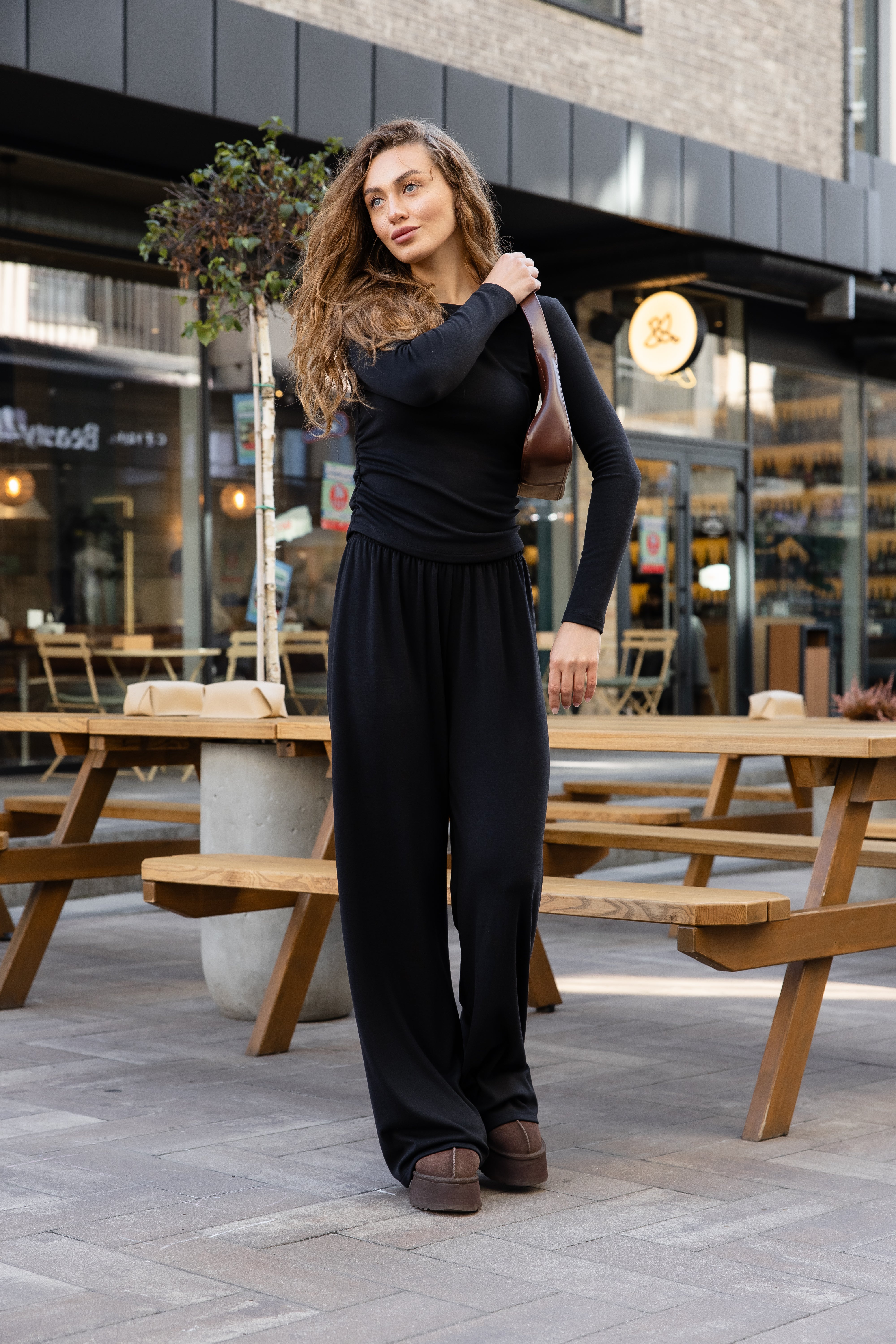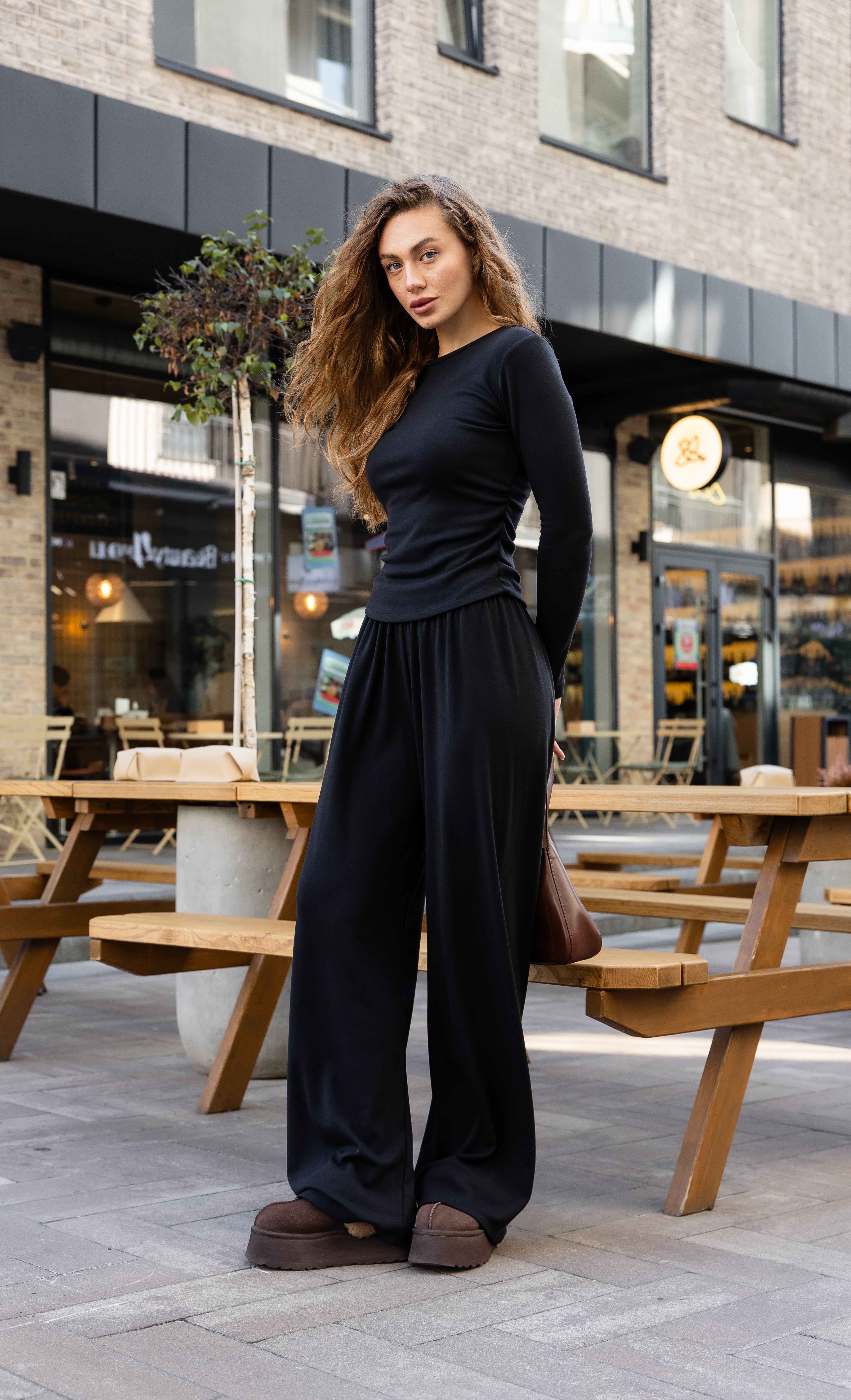 Лонгслів має легку драпіровку з боків, яка візуально підкреслює талію та робить силует більш жіночним.