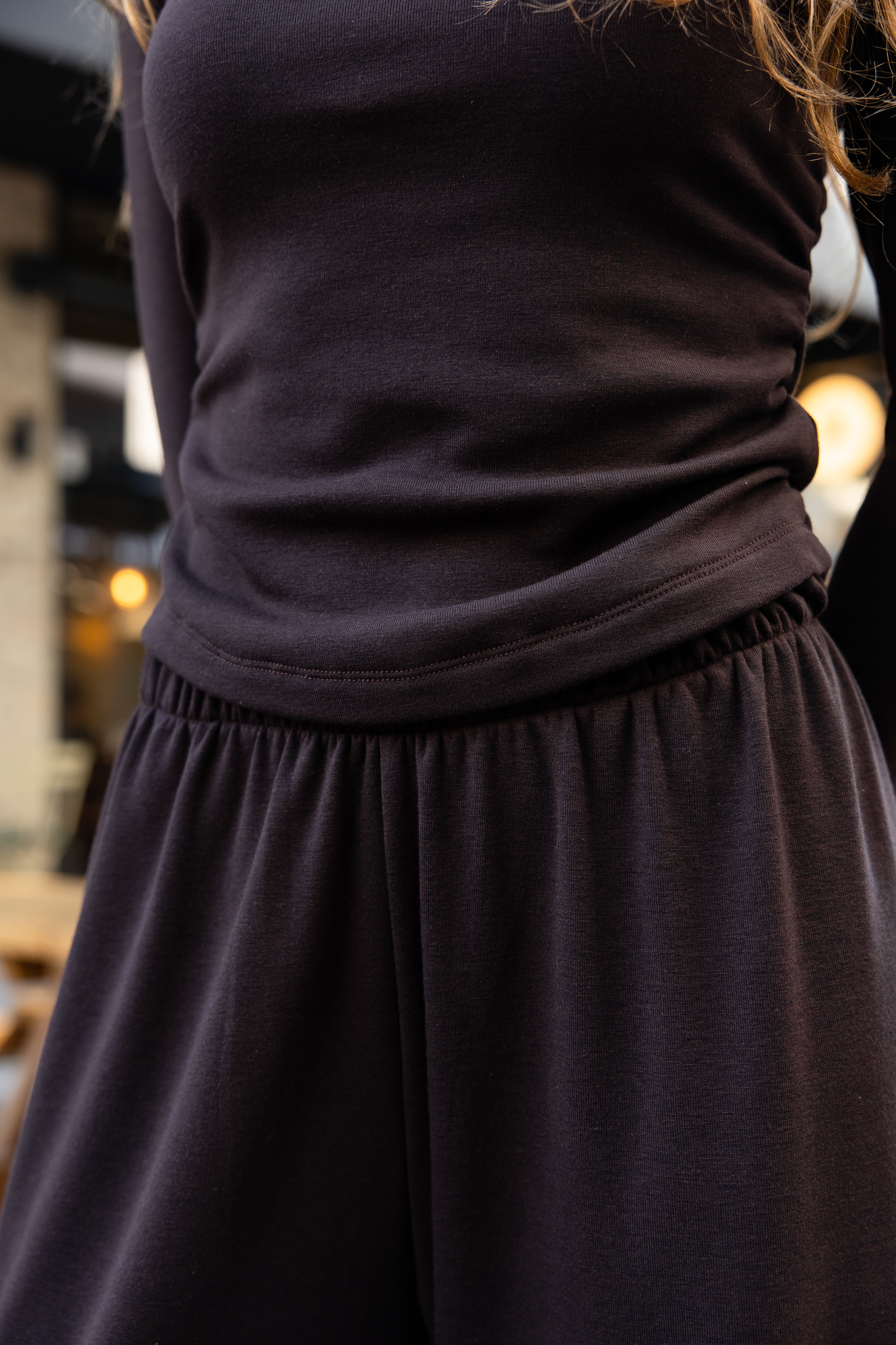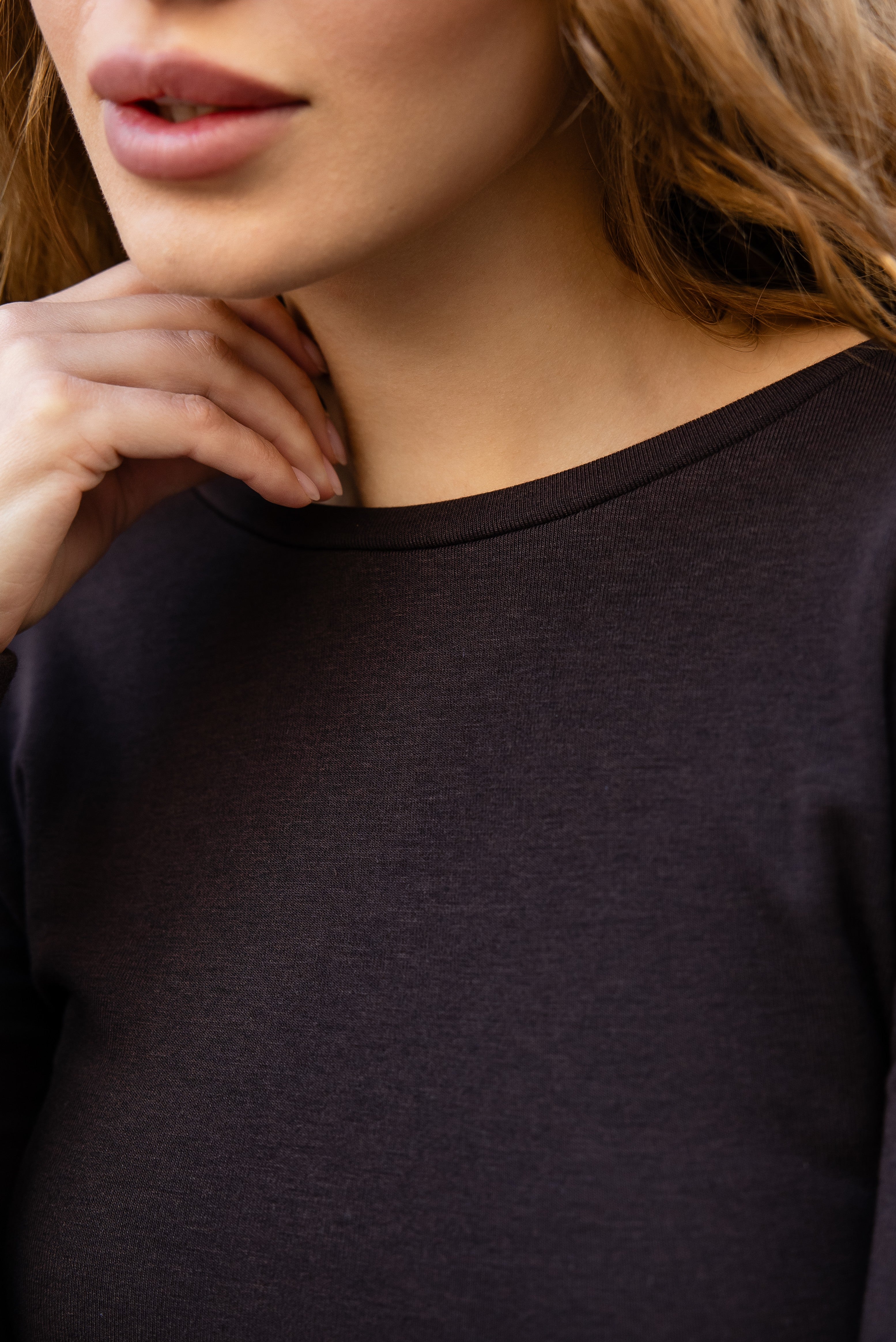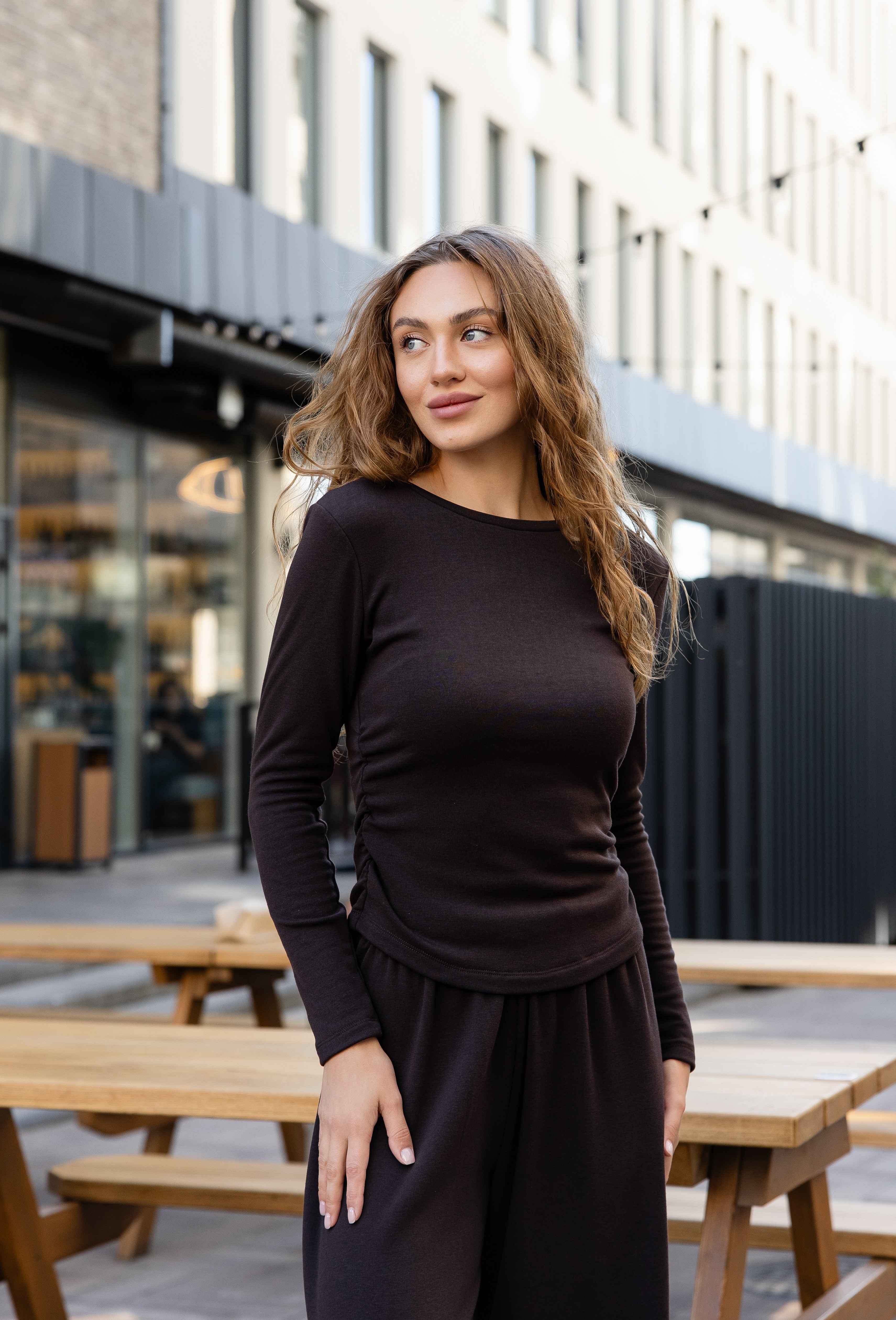 Лонгслів має легку драпіровку з боків, яка візуально підкреслює талію та робить силует більш жіночним.
