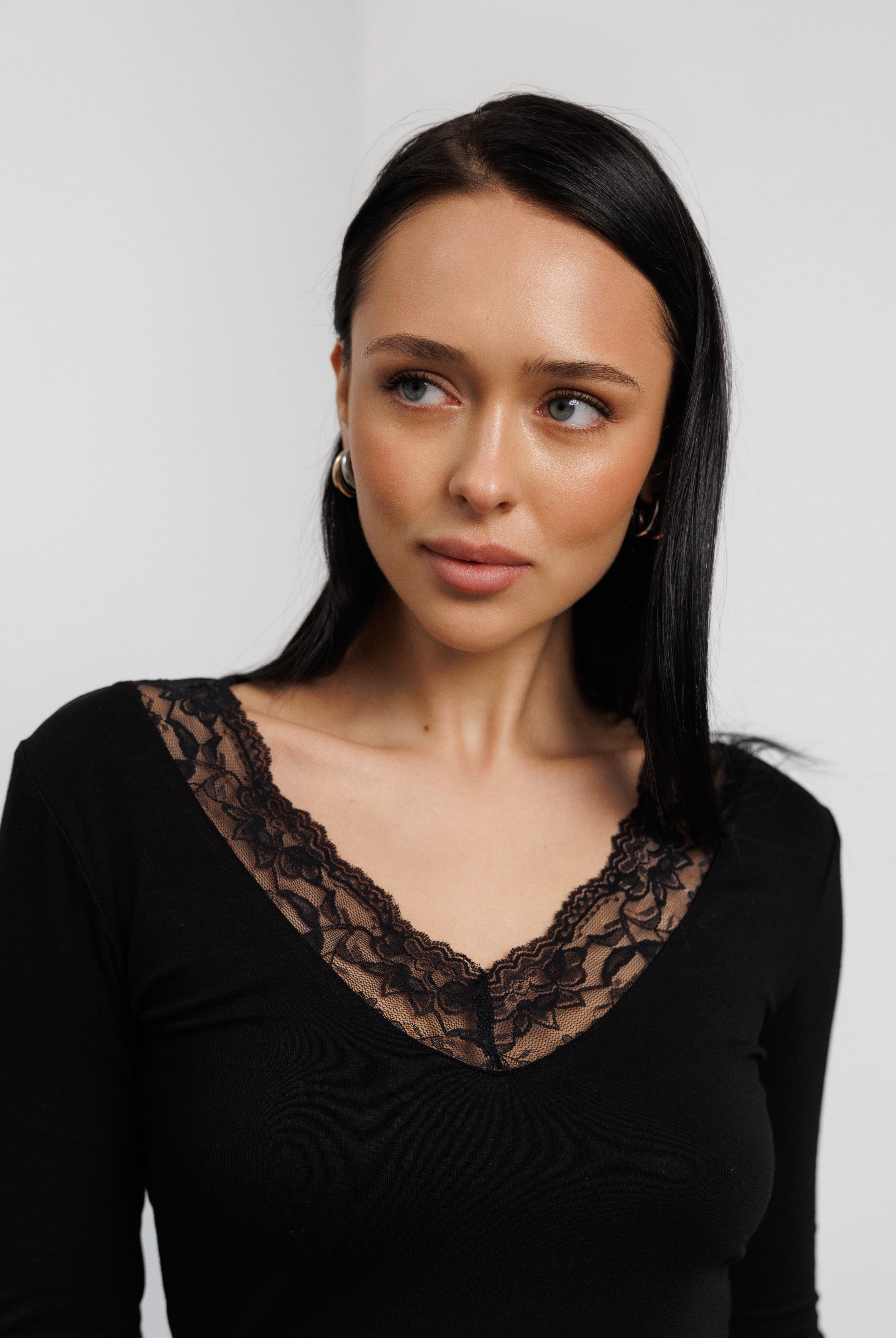 V-подібний виріз горловини та манжети оздоблені делікатним мереживом, що додає образу ніжності й елегантності.