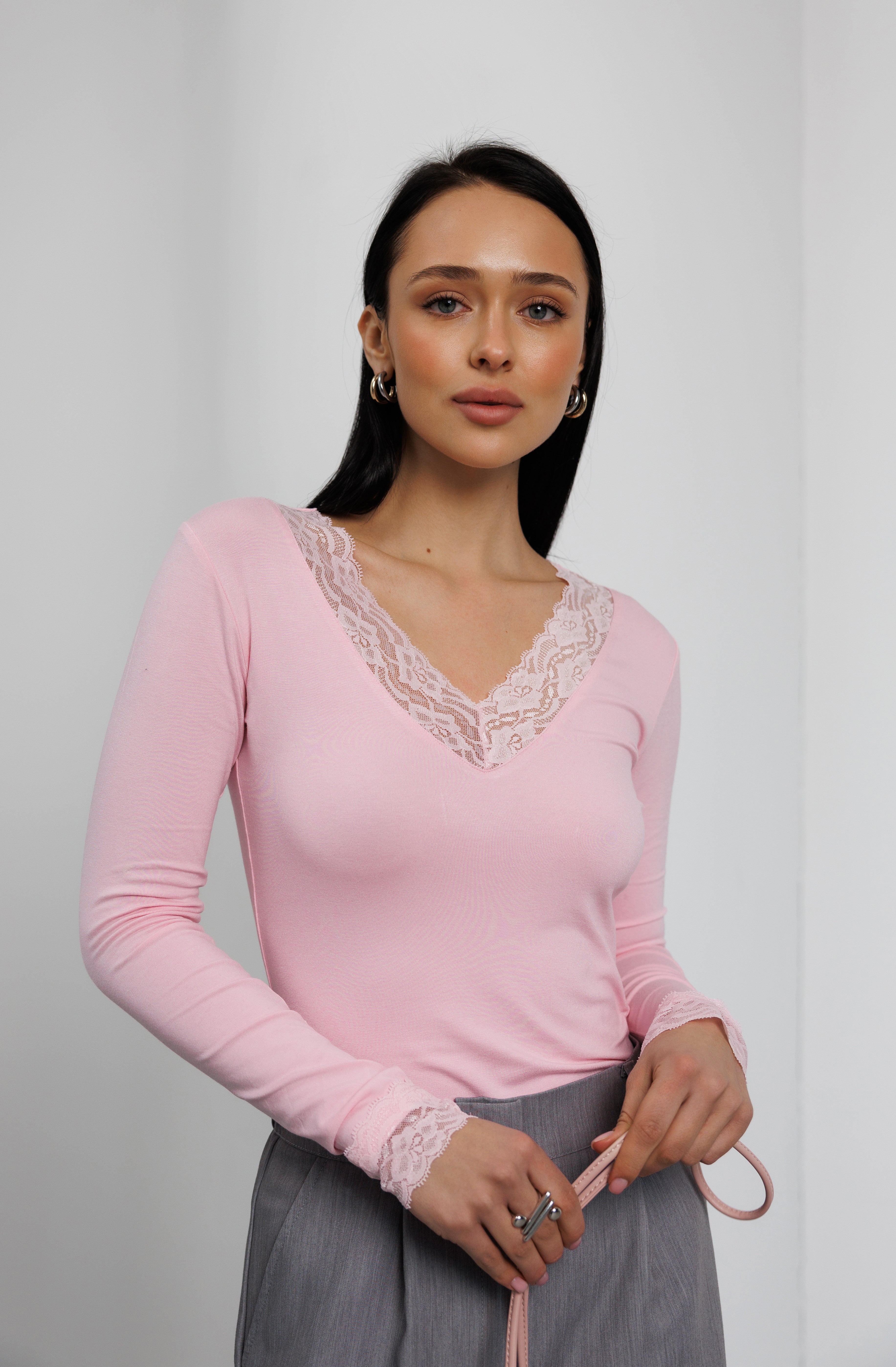 V-подібний виріз горловини та манжети оздоблені делікатним мереживом, що додає образу ніжності й елегантності.