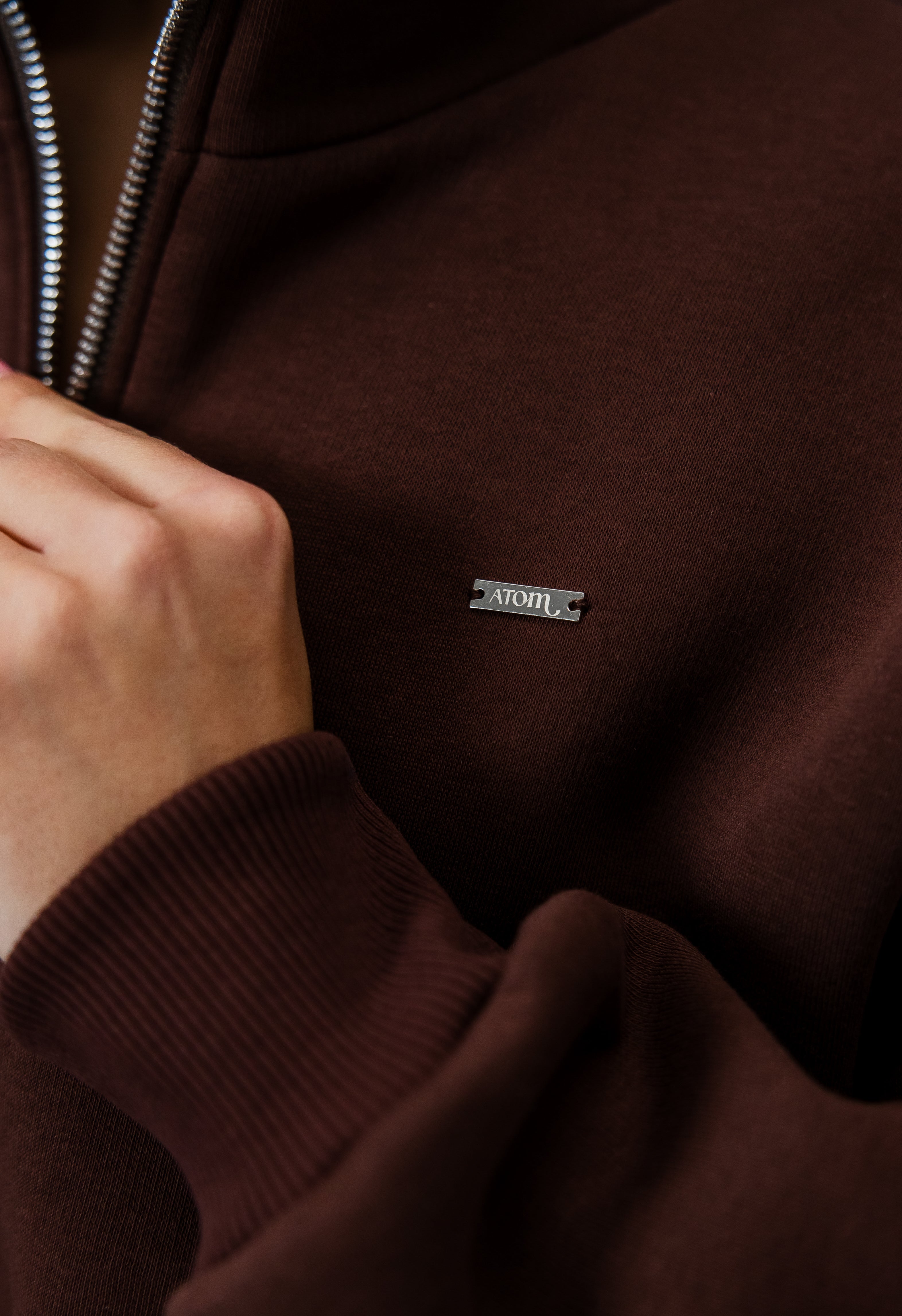 Світшот виконаний з високим коміром і металевою блискавкою, що додає образу сучасності та комфорту. На грудях — акуратна металева плашка-лого, яка підкреслює мінімалістичний дизайн.