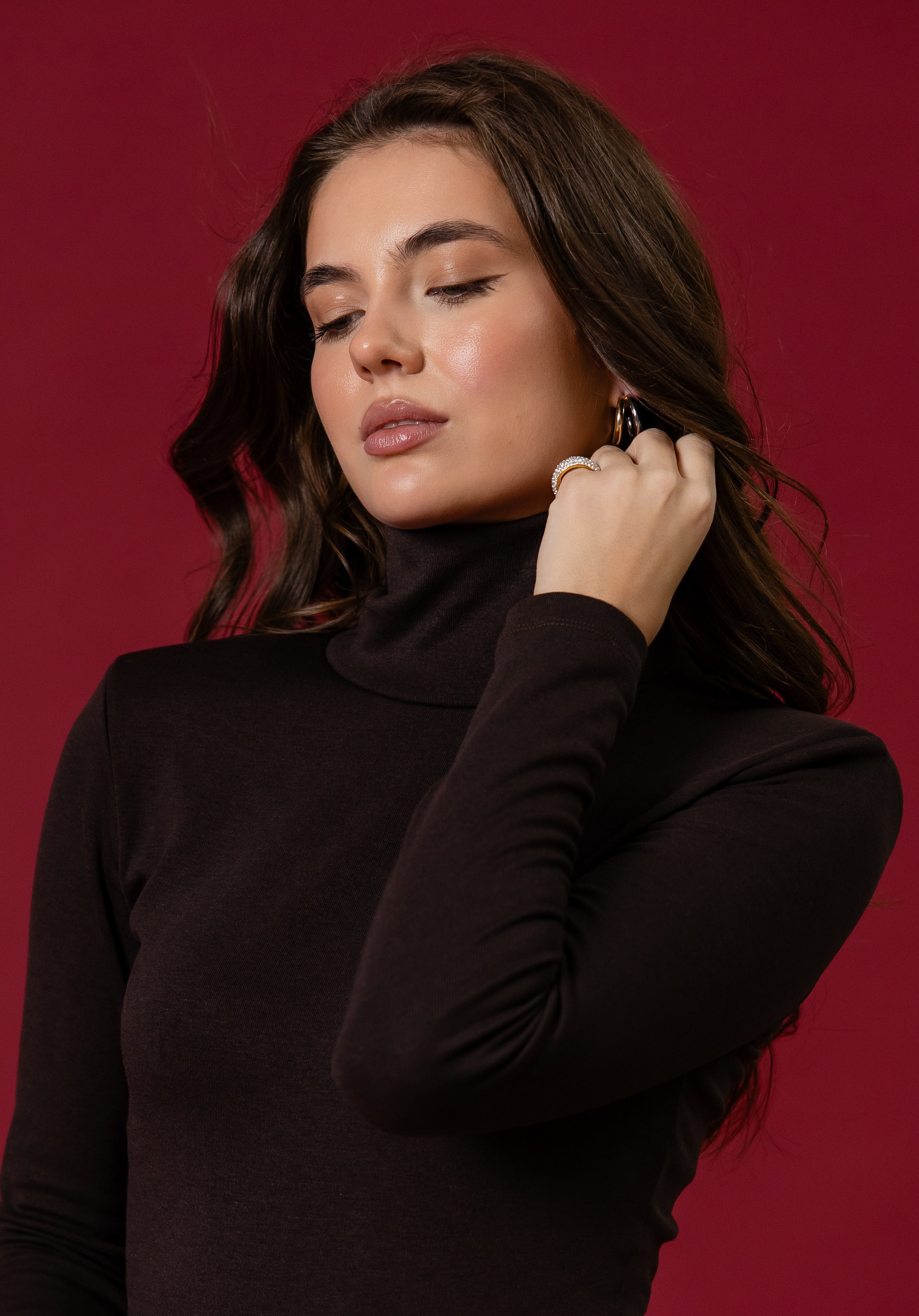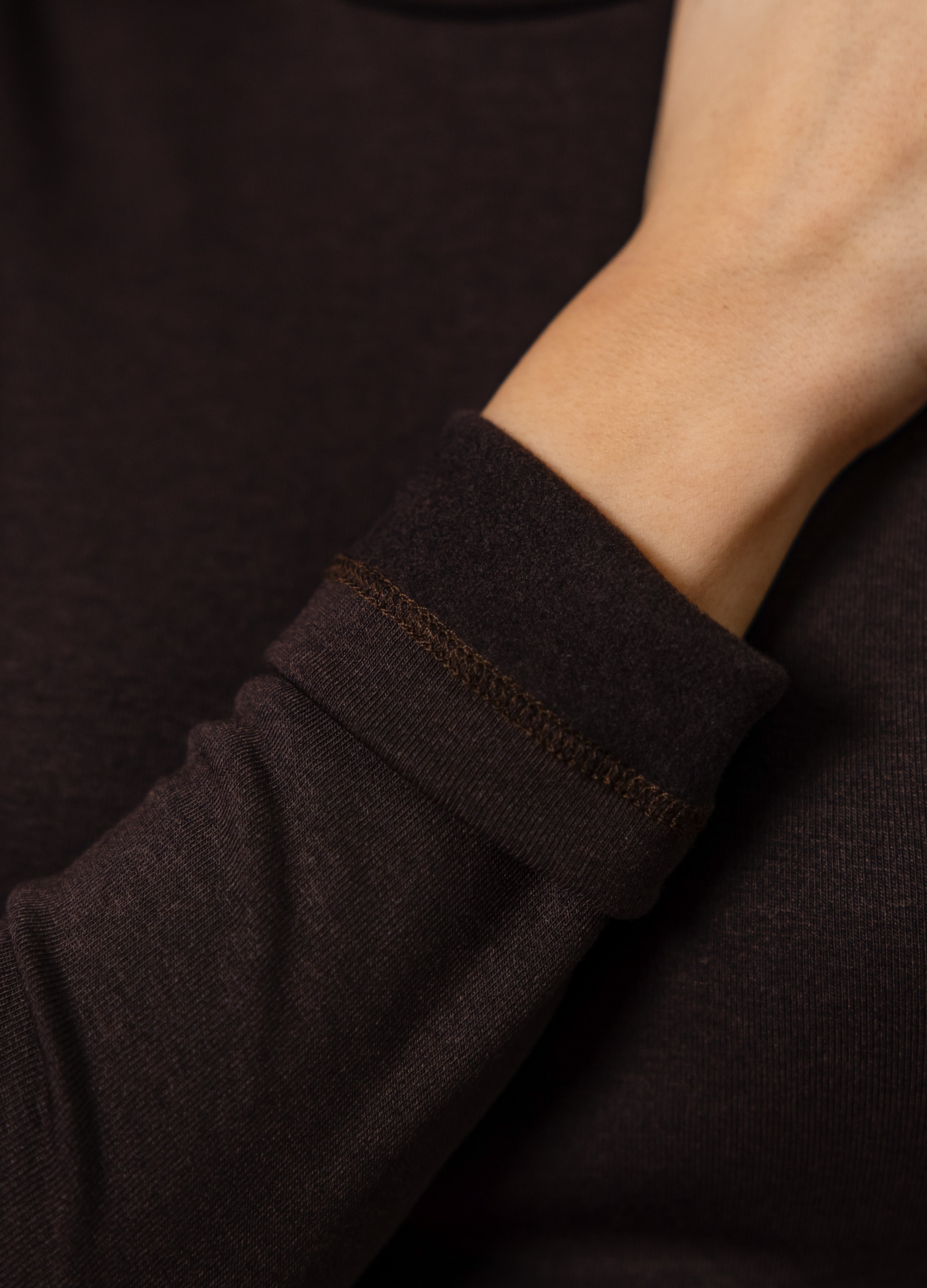 Завдяки мінімалістичному дизайну та теплій основі на флісі, цей гольф чудово підходить як для щоденного носіння, так і для більш елегантних образів. Має високий прилеглий комір, який акуратно облягає шию та структуровані плечі — лінія плеча рівна й чітка, завдяки чому верх виглядає охайно та підкреслено.