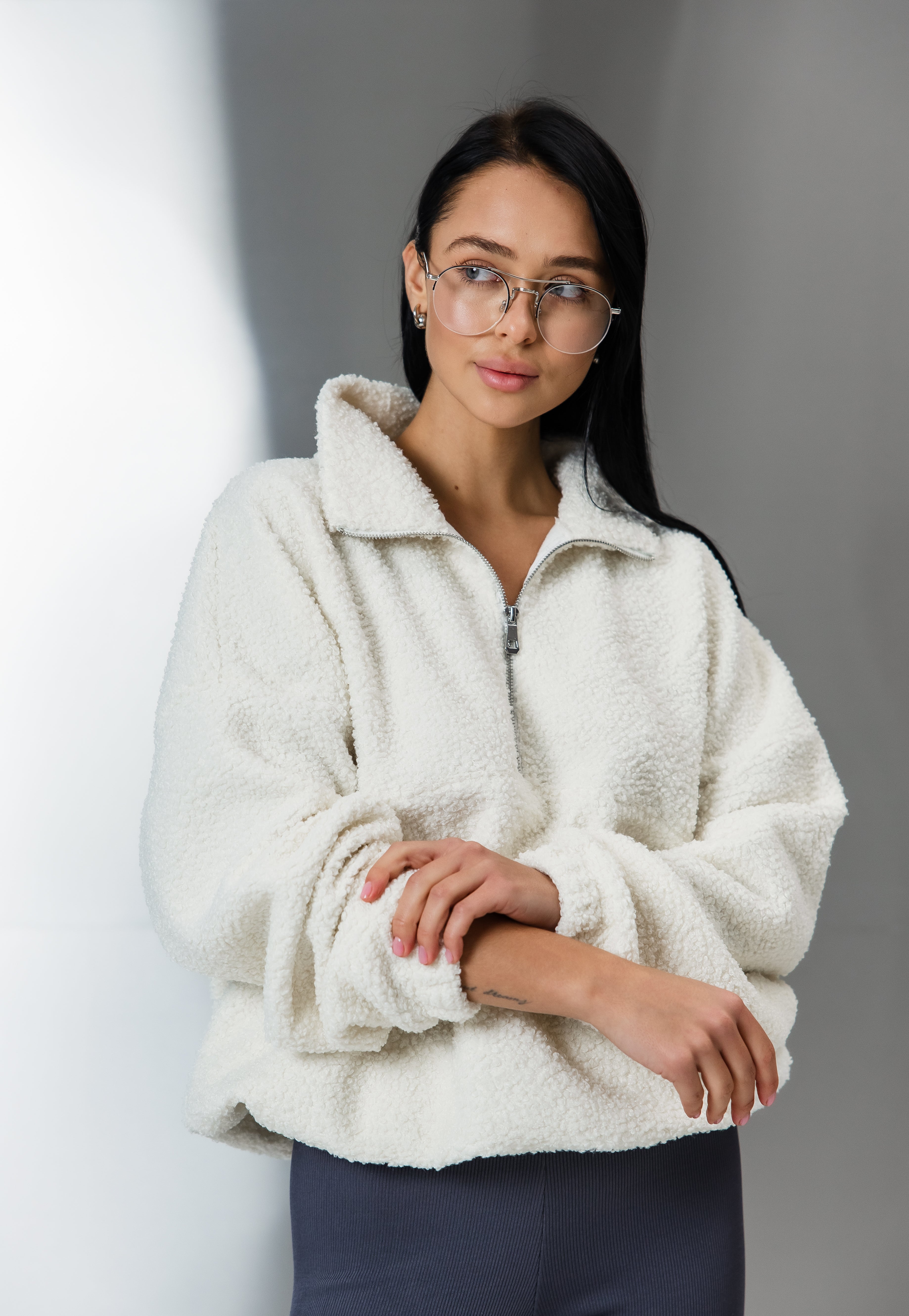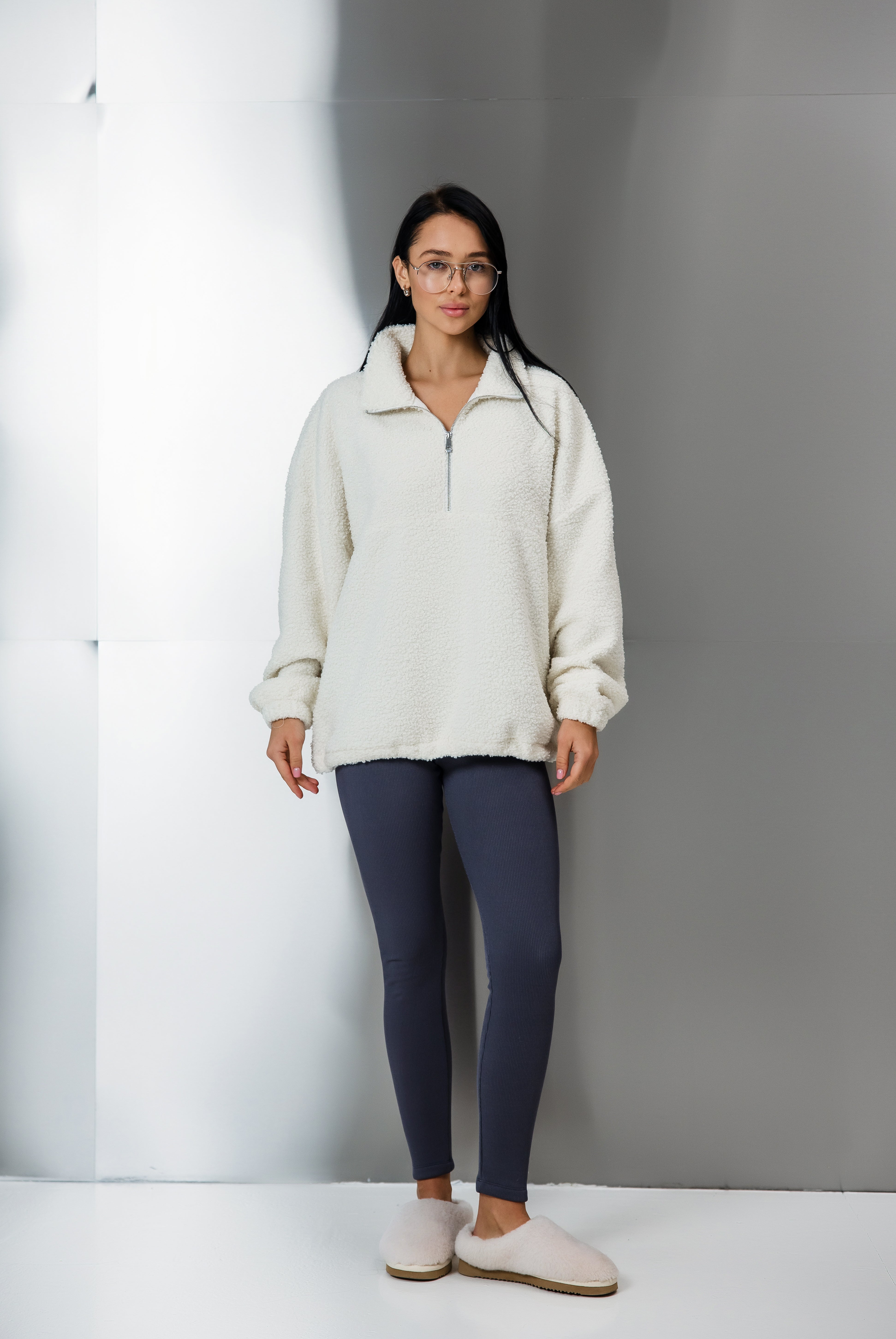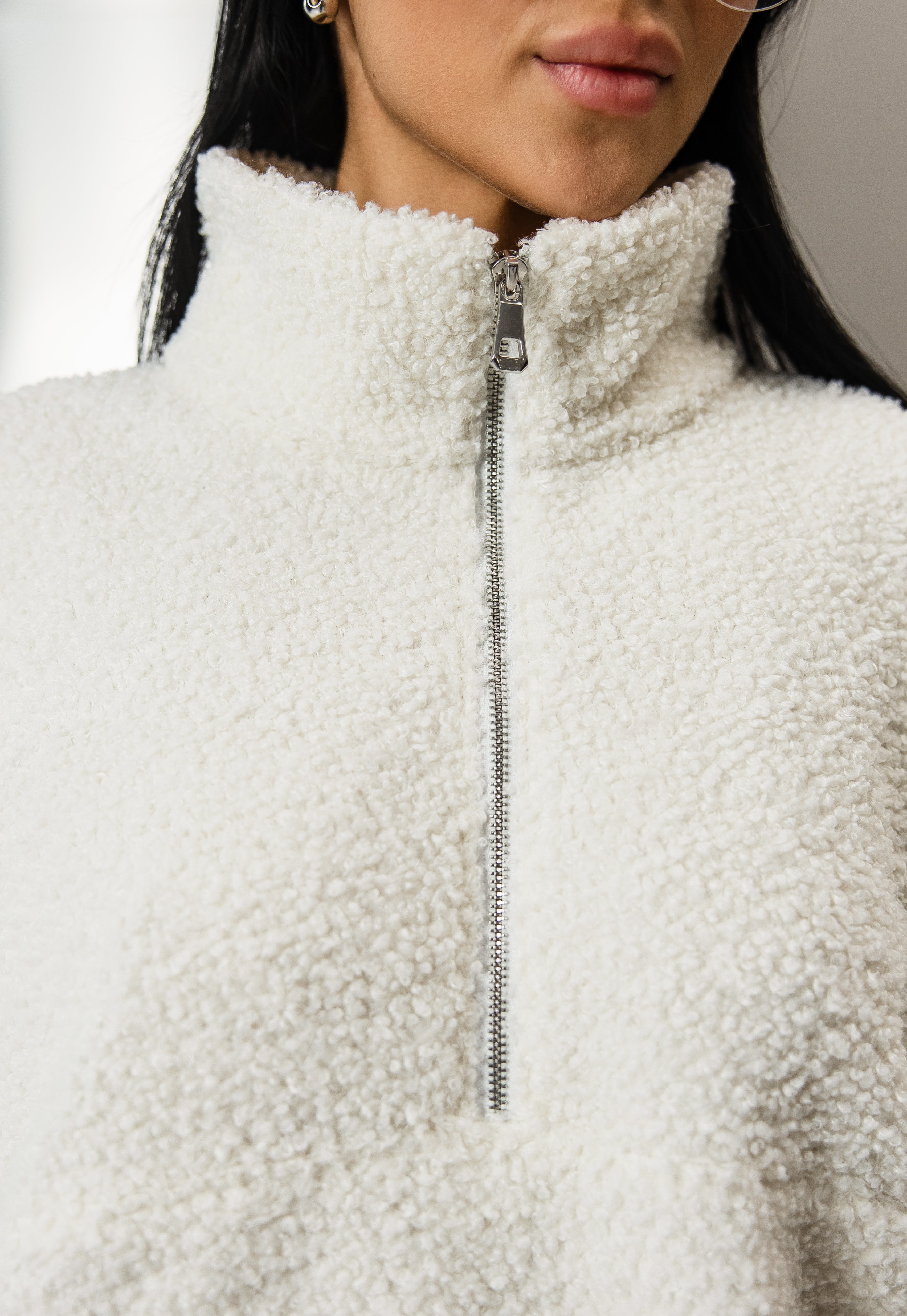 Об’ємна тедді-кофта з м’якої пухнастої тканини, що чудово зберігає тепло. Модель оснащена напівблискавкою та коміром-стійкою для додаткового захисту від холоду.